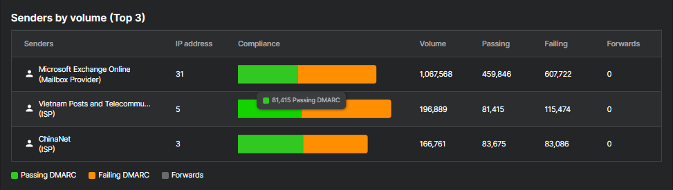 In diesem Abschnitt werden die drei Top-Absender nach Volumen und deren DMARC-Compliance-Aufschlüsselung angezeigt.