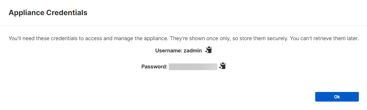 Ein Popup-Fenster mit den Appliance-Anmeldeinformationen wird angezeigt. Sie benötigen die Anmeldeinformationen, um auf die Appliance zuzugreifen, die die Konsole hostet.
