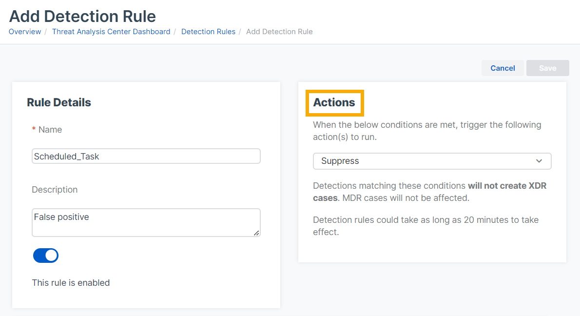 Derzeit können Sie nur Unterdrücken auswählen. Dadurch wird verhindert, dass Erkennungen in der Erkennungsliste angezeigt werden und Fälle generiert werden.