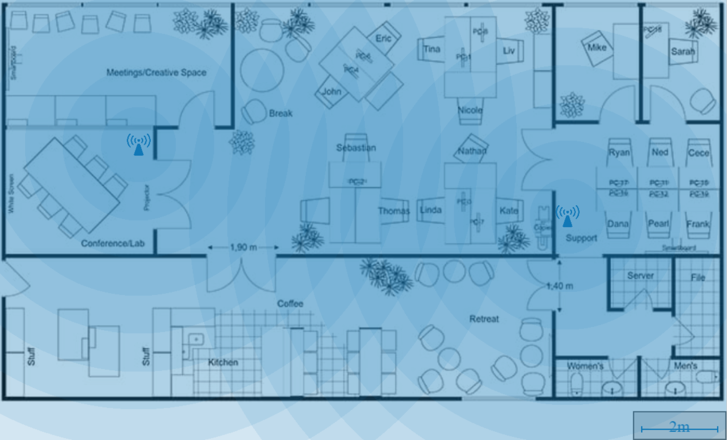 Hier ist ein Beispiel für einen WLAN-Grundriss, der die Skala, zwei platzierte Access Points und deren WLAN-Abdeckung zeigt: