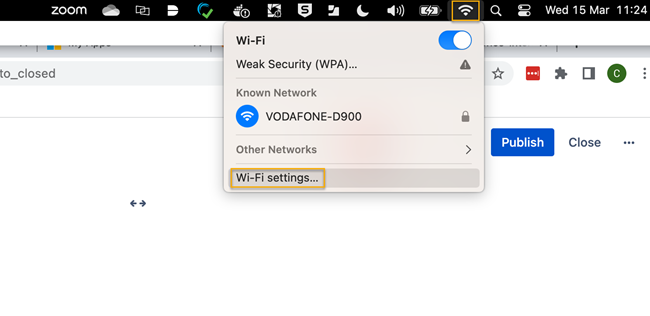 On the Mac device, in the top right, select your network. For example, click the Wi-Fi logo and select Wi-Fi settings.