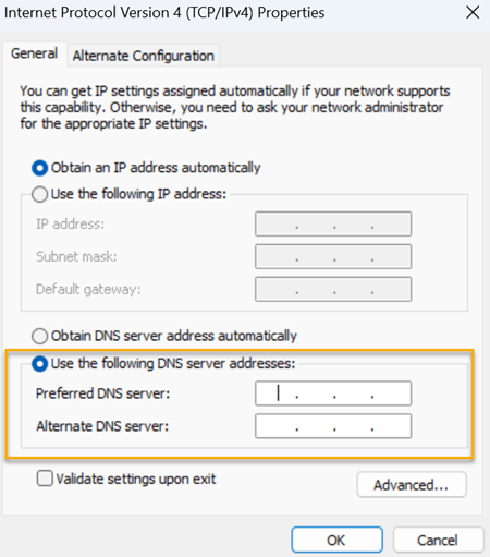 On the General tab, select Use the following DNS server addresses.