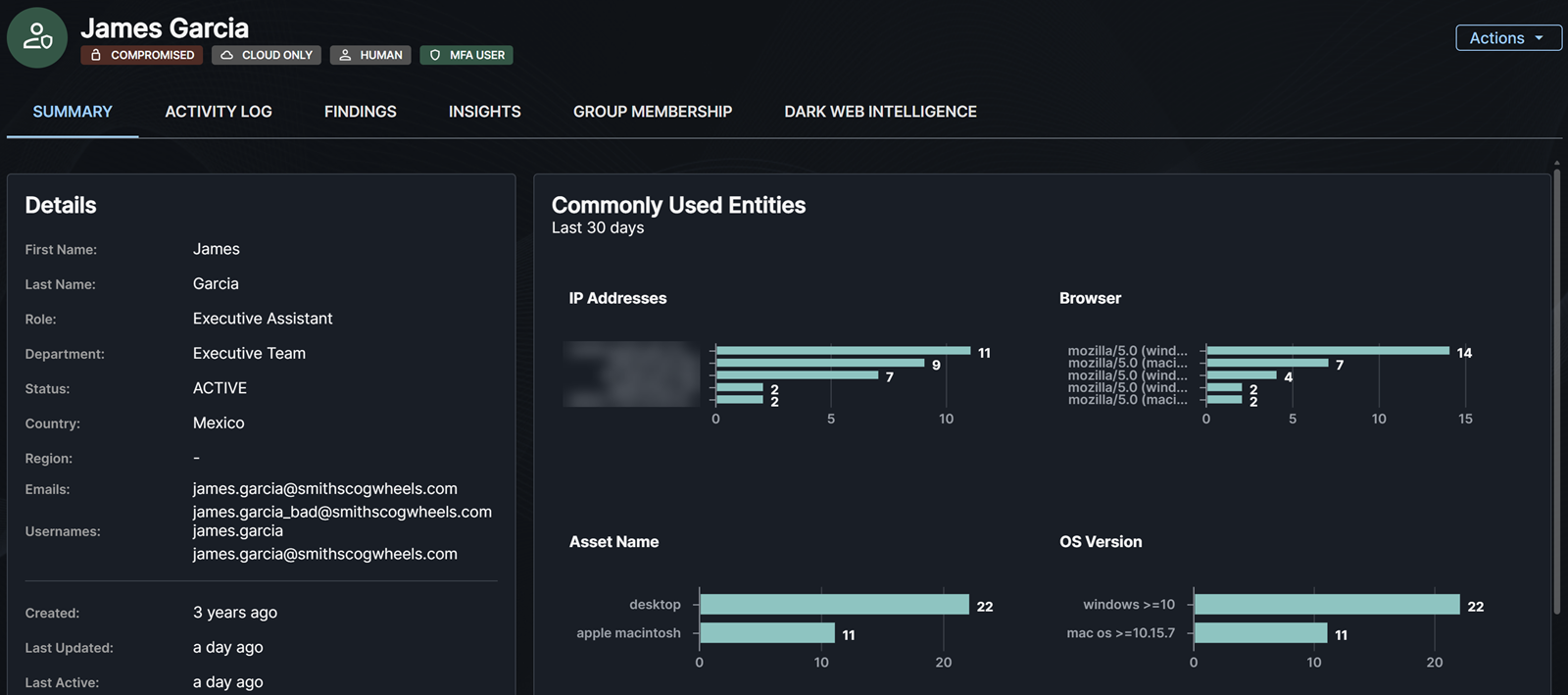 The Commonly Used Entities section provides insights into some of the attributes related to successful authentications over the last 30 days. This helps you understand the profile of the user and what is common or uncommon. The following graphs show when we have relevant data for the user:
