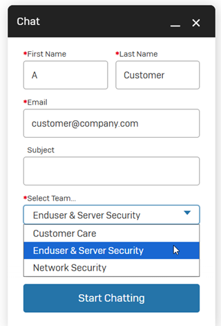 In the Chat screen, enter your details and select the team you need help from. Then click Start Chatting.
