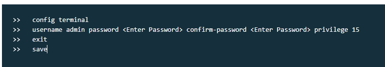 config terminal username admin password <Enter Password> confirm-password <Enter Password> privilege 15 exit saveMake sure to replace