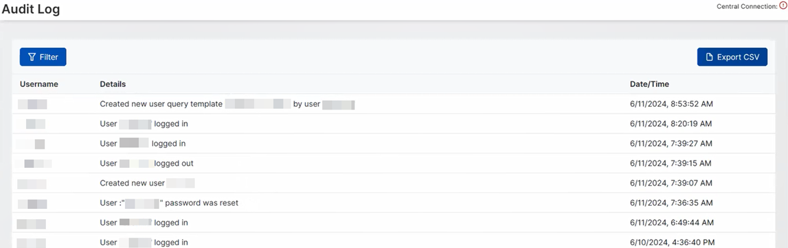 Haga clic en Exportar CSV para exportar el registro de auditoría a un archivo .csv. El archivo se descargará en su dispositivo local.