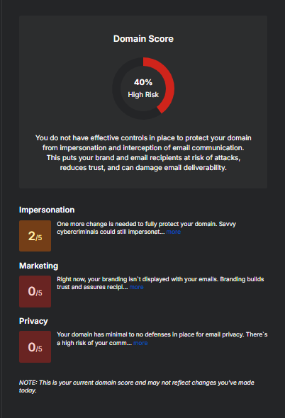 - Si DMARC est manquant, mal configuré, ou défini sur Aucun, votre score sera bas.
