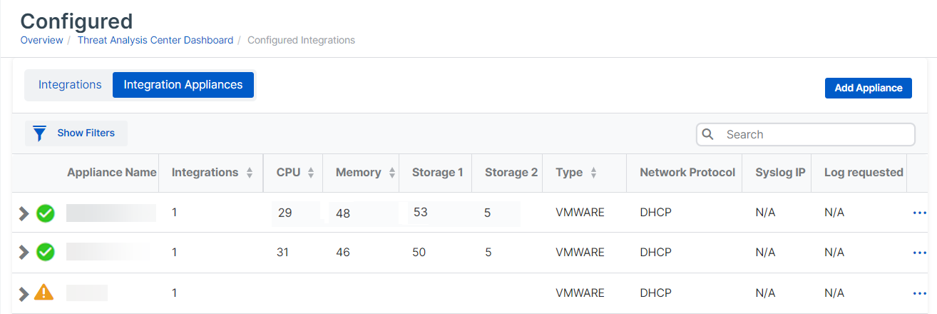 Pour voir vos appliances, allez dans Centre d’analyse des menaces > Intégrations > Configuré et sélectionnez l’onglet Appliances d’intégration.