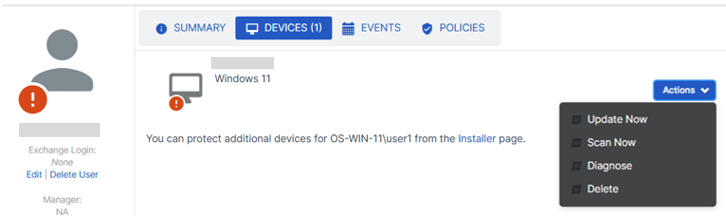 - Supprimer : Cette action supprime l'appareil de Sophos Central. Sophos Central cesse de gérer l’appareil, mais nous ne désinstallons pas le logiciel Sophos.
