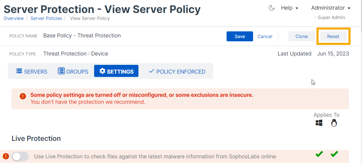 2. Verrà aperta la scheda Impostazioni nella pagina del criterio. Nella parte alta della scheda verrà visualizzato un avviso e le impostazioni che differiscono da quelle consigliate saranno evidenziate in rosso.