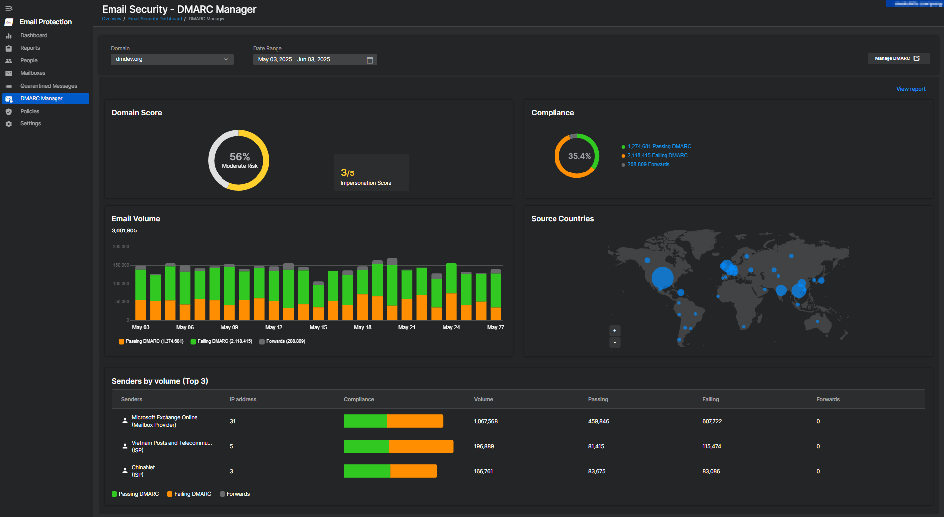 Per visualizzare il riepilogo di DMARC Manager, aprire Prodotti > Email Protection > DMARC Manager.