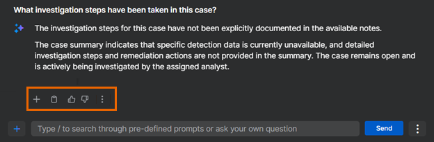 - 事前定義プロンプトを選択します。これらは、ケースサマリの生成、デバイス上のアクティビティの詳細の取得、実行可能なアクションの表示などを行うことができます。