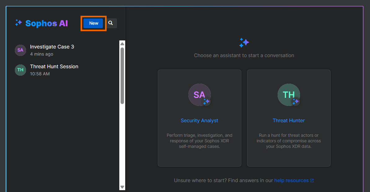 1。 チャットを終了するには、Sophos AI ページを閉じるか、「新規」をクリックして別のチャットを開始してください。
