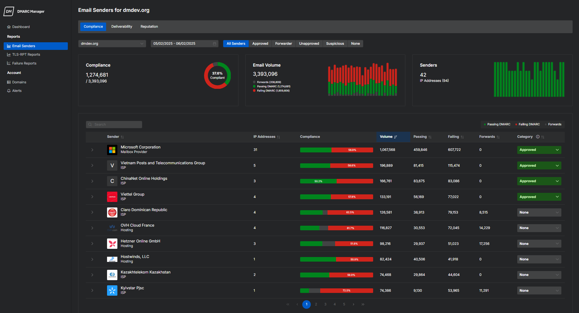 - レポート状態と DMARC 準拠のメールのボリュームについてのサマリーを使用して、ドメインのセキュリティ状態を監視します。