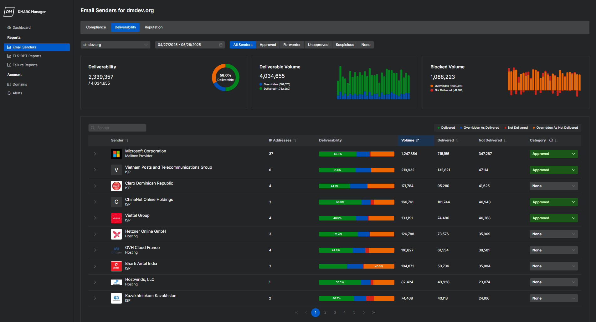 「配信性」には、お使いのドメインのメールが成功裏に配信されているか、ポリシー執行によってブロックされているかが表示されます。