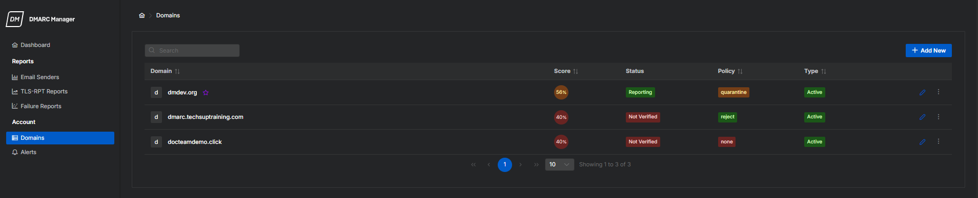 「ドメイン」ページには、DMARC Manager に追加されたドメインが表示されます。DMARC スコア、検証ステータス、ポリシー施行レベル、およびドメインの種類などの重要な詳細を提供します。