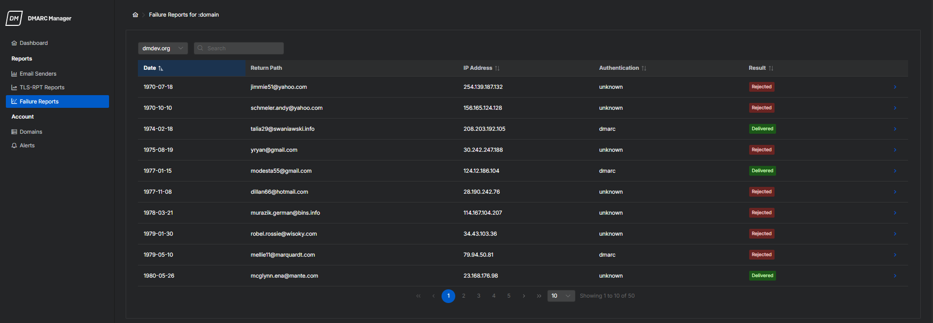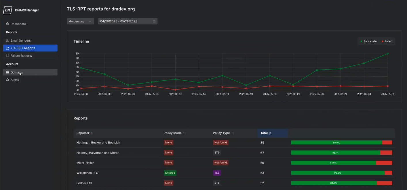 このセクションには、メール送信者、TLS-RPT レポート、およびエラーレポートの詳細ビューが含まれています。これらのレポートを使用して、ドメイン全体での認証動作を監視し、問題のトラブルシューティングを行います。