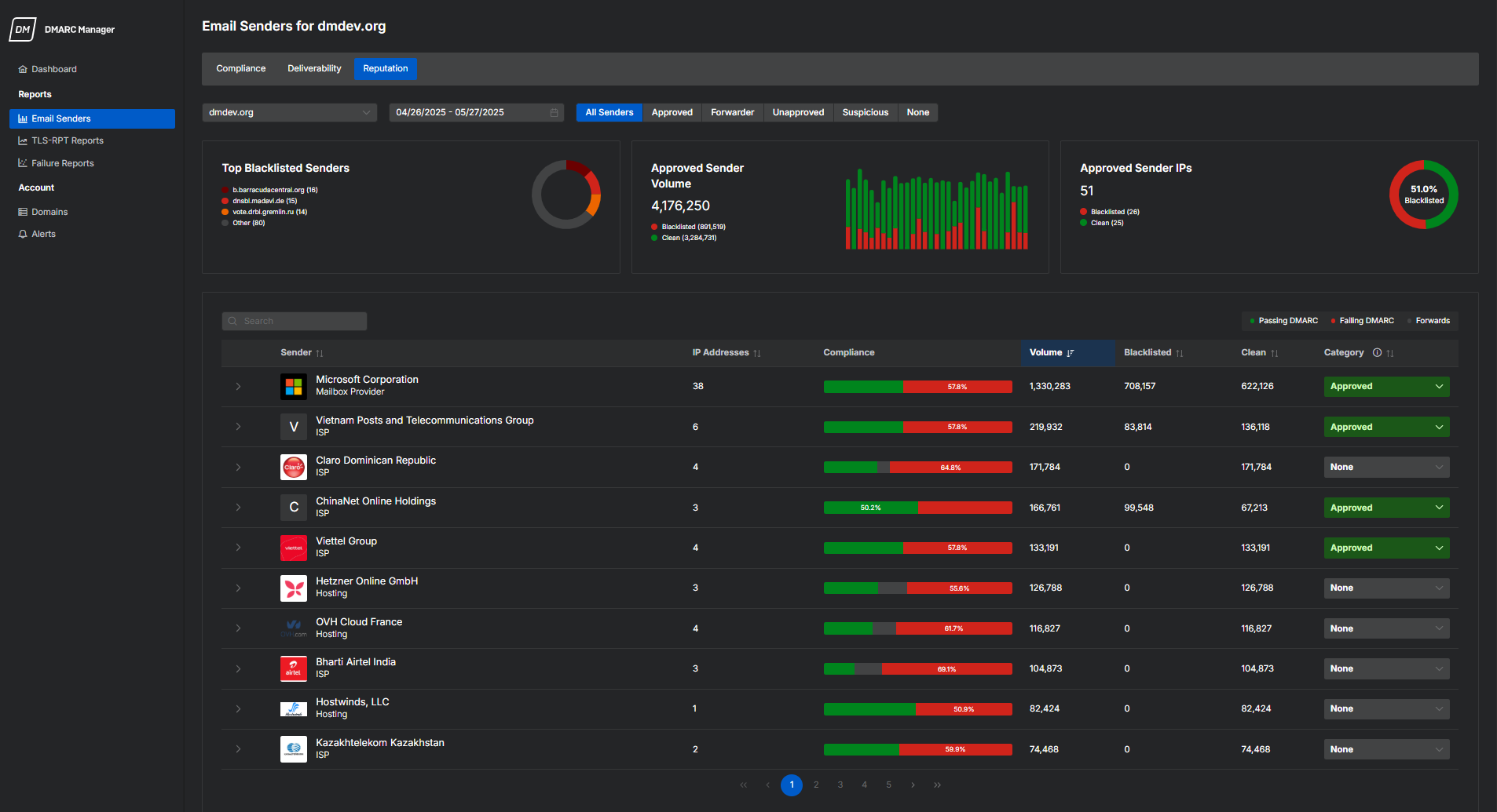 DMARC Manager ポータルを使用すると、ドメイン認証のセットアップを管理したり、送信者のアクティビティを確認したり、全体的な DMARC コンプライアンスを追跡したりできます。