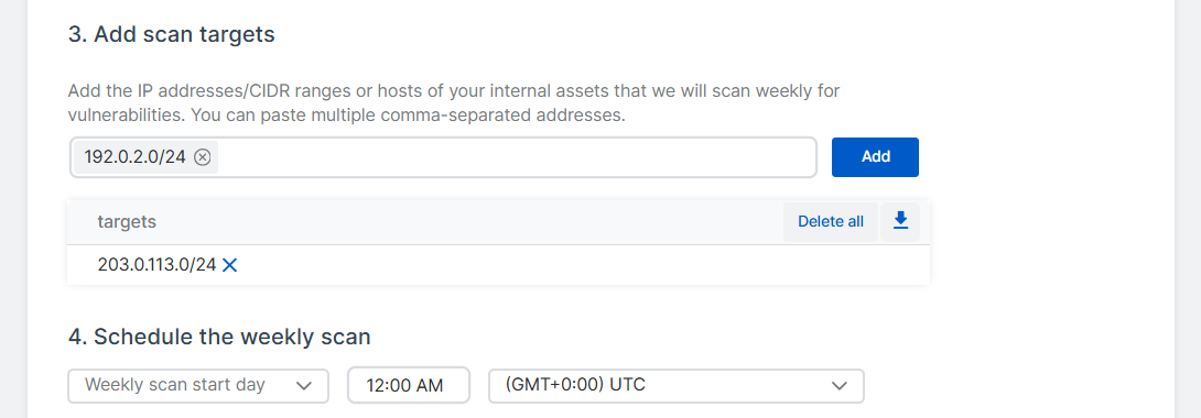内部アセットのスキャンを設定する前に、許可された連絡先を追加し、外部アセットのスキャンを設定する必要があります。詳細は、Managed Risk セットアップを参照してください。