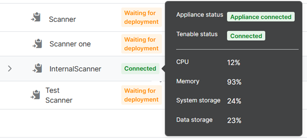リスト内のスキャナに移動します。「状態」にカーソルを合わせると、詳細が表示されます。アプライアンスの状態が、「ダウンロード済み」から「アプライアンスを待機中」、「プラグインを読み込み中」、「接続済み」に変化します。