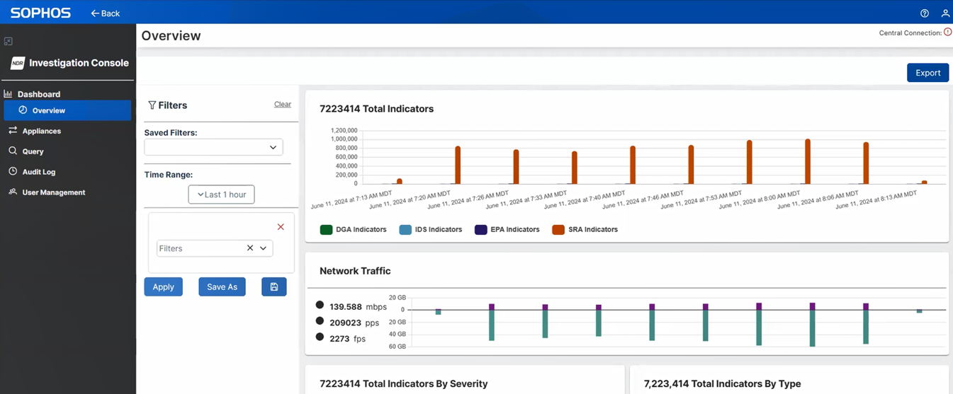 調査コンソールにサインインすると、「ダッシュボード - 概要」ページに移動します。このページには、感染の痕跡の合計、ネットワークトラフィック、ジオ位置情報マップ、および最近のフロー検出が表示されます。
