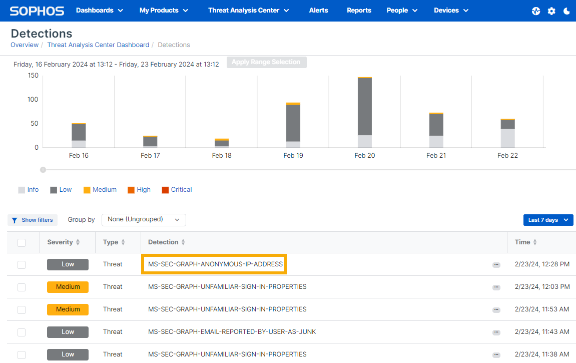 Microsoft Graph セキュリティ API で受信した検出イベントは、Sophos Central の「検出」ページで確認できます。この例に示すように、検出には MS-SEC-GRAPH-xxxxx というラベルが付けられます。
