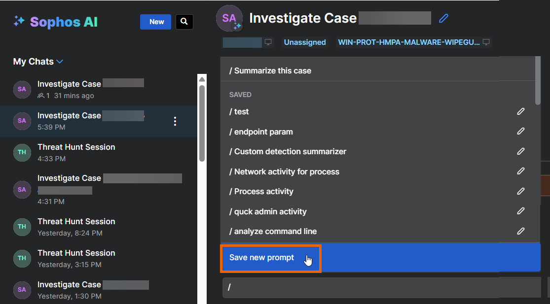 프롬프트 목록은 최근에 사용한 프롬프트와 저장된 프롬프트, 그리고 Sophos에서 제공하는 사전 정의된 ('정형화된') 프롬프트를 포함한 추천 프롬프트 목록입니다.