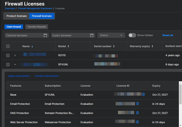 Sophos Firewall 라이선스에 대한 자세한 내용은 Sophos Firewall: 라이센스 정보.