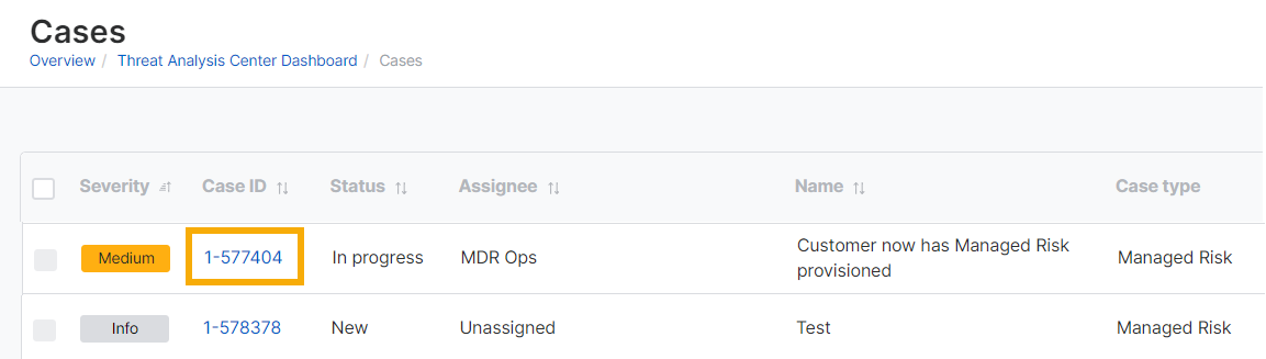 이 페이지에는 XDR, MDR 및 관리 위험 사례가 표시됩니다. XDR 고객이면 XDR 케이스를 직접 조사할 수 있지만, MDR 및 관리 위험 케이스는 Sophos 팀만 처리할 수 있습니다.