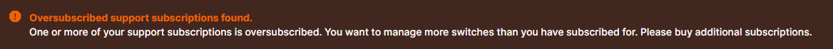 Você deve adquirir uma assinatura de suporte para cada switch implantado. Se você aplicar uma licença de assinatura de suporte a mais switches do que os cobertos pela licença, verá o banner a seguir.