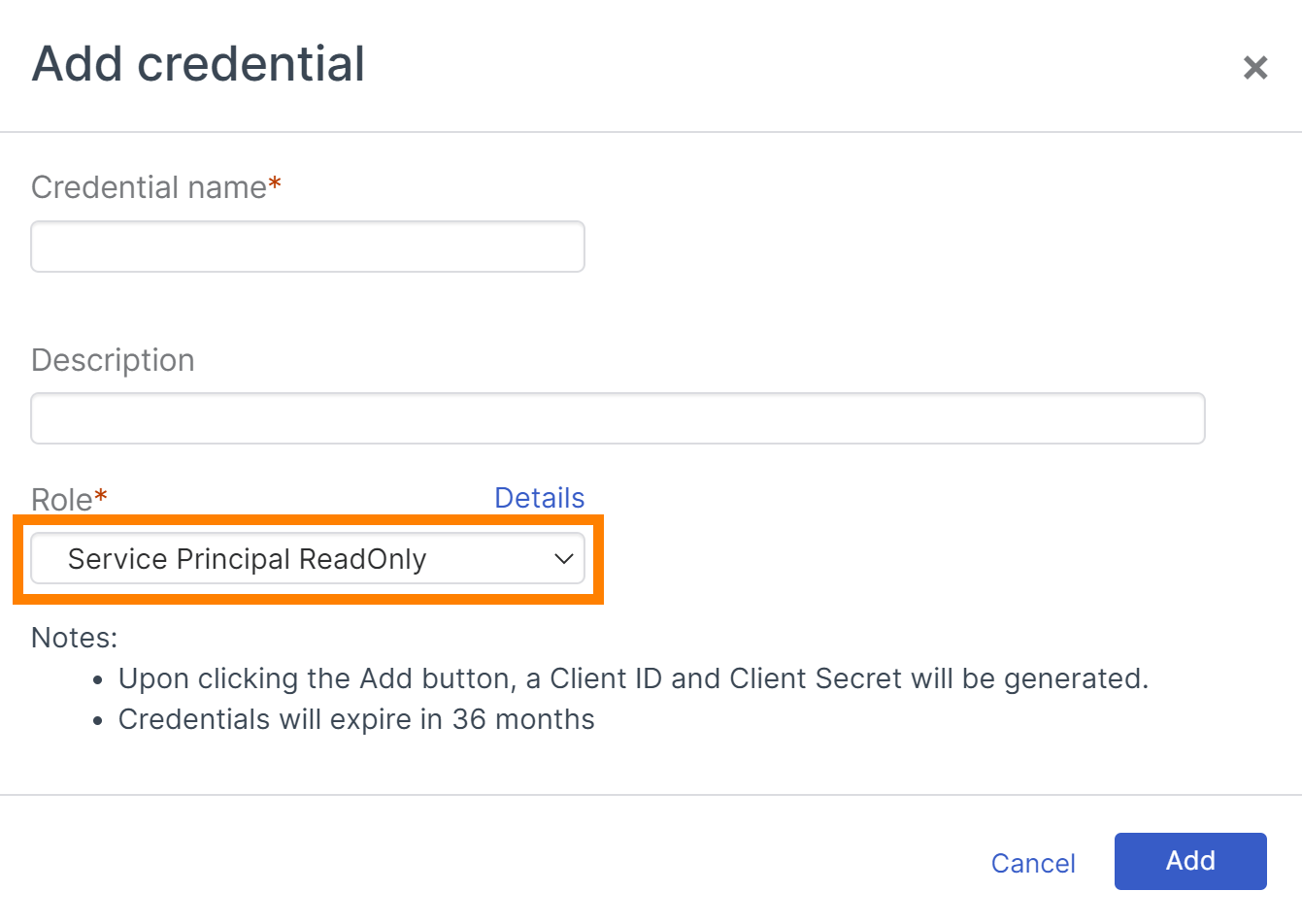Na caixa de diálogo Adicionar credencial, faça o seguinte: