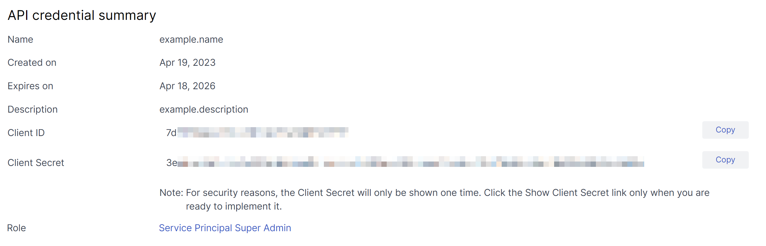 Na página Resumo de credenciais de API, copie os valores de ID do cliente e Segredo do cliente.