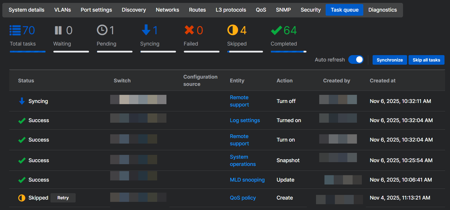 - Ignorada: A tarefa foi ignorada. Clique em Tentar novamente para sincronizar a tarefa com o switch.