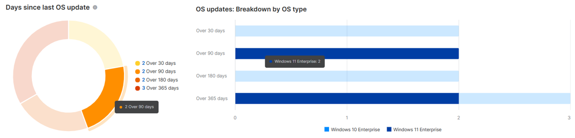 Você pode passar o mouse sobre os gráficos para ver o número de dispositivos em cada categoria específica. Por exemplo, passe o mouse sobre a seção laranja do gráfico Dias desde a última atualização de SO para ver quantos dispositivos foram atualizados pela última vez há mais de 90 dias.