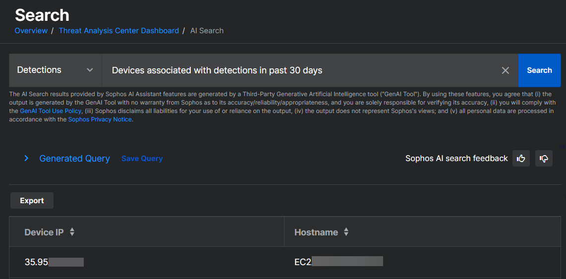 A Pesquisa por IA permite a você pesquisar dados no Sophos Data Lake sem escrever consultas SQL.