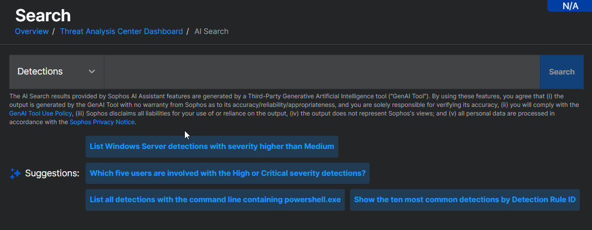 Se esta for a primeira vez que você abre a Pesquisa por IA depois de entrar no Sophos Central, você verá as consultas sugeridas na barra de pesquisa.