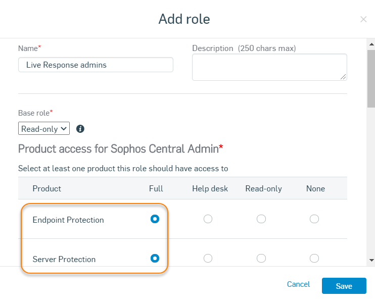 如果您選取 諮詢台 存取,您可授予該角色執行 Live Response 工作階段的權限,但不會授予其管理產品設定的權限。