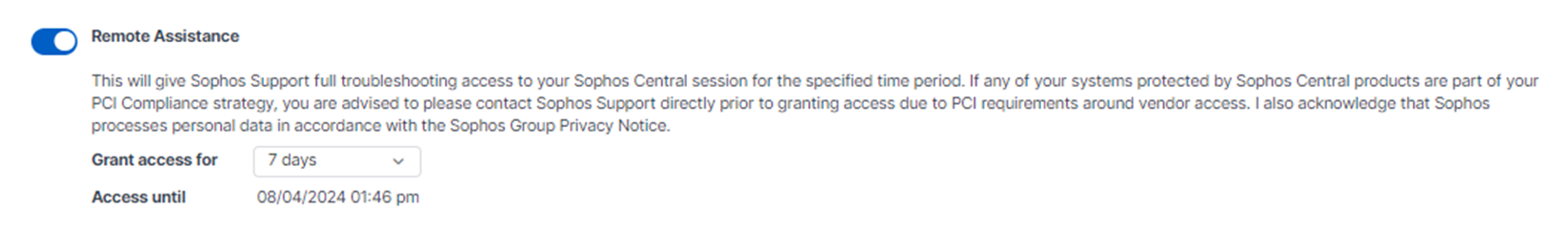 Remote Assistance allows Sophos Support to access your Sophos Central session directly for a specified period. This option is turned off by default.