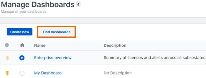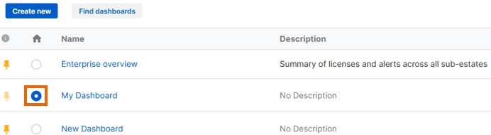 Puede definir cualquier panel de control como predeterminado. Esto también se aplica a un panel de control que haya creado. Haga clic en el botón de la columna Definir como predeterminado para el panel de control que desee. Puede volver a cambiar el panel de control predeterminado en cualquier momento.