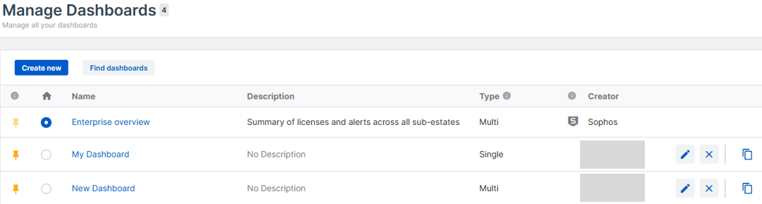 En la columna Creador, la insignia de Sophos indica un panel de control que hemos creado nosotros. Los paneles de control personalizados muestran el nombre del administrador que los haya creado.