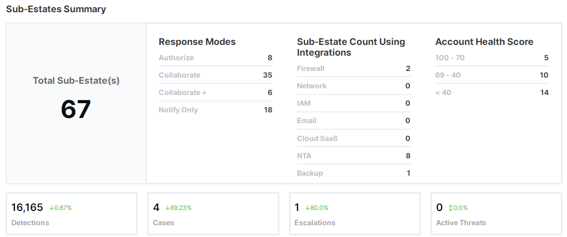 Indique le pourcentage de variation dans les détections. Les détections sont des indicateurs d’activité générés par la technologie qui sont pondérés et classés en fonction de leur potentiel de menace. Dans la majorité des cas, ces points de données sont purement informatifs et ne donnent pas lieu à la création d’un dossier en soi. Les détections comprennent souvent des éléments tels que des exécutions de commandes, des sockets réseau ouverts, des événements d’authentification, des applications en cours d’exécution.
