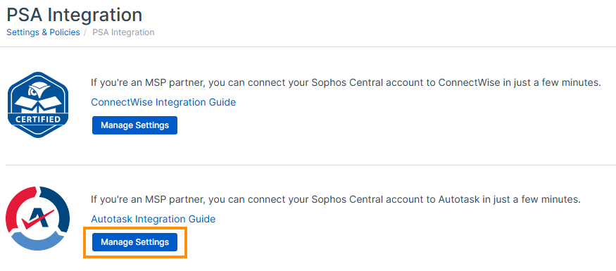 Klicken Sie auf der Seite PSA-Integration auf Einstellungen verwalten.