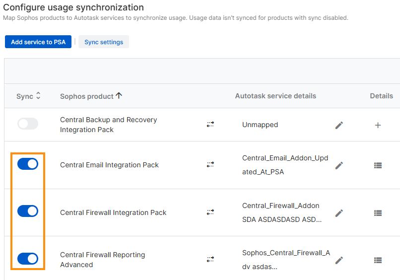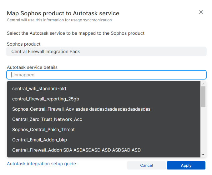 Sie können Ihre Sophos-Produkte Autotask-Services zuordnen und die Nutzungssynchronisierung für diese Produkte konfigurieren.