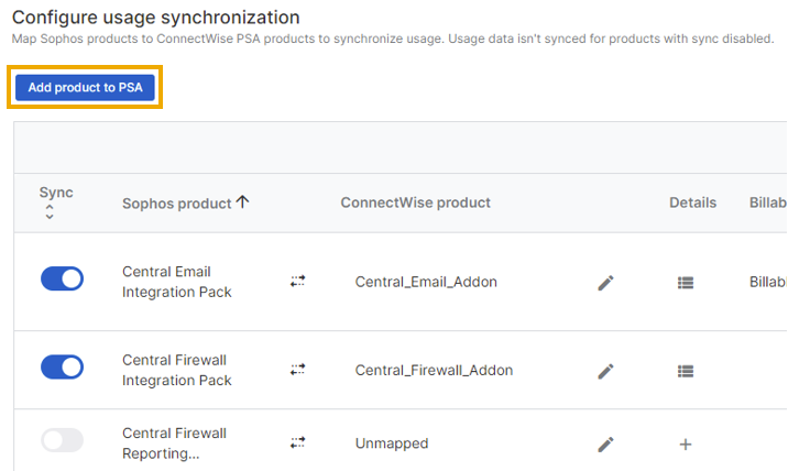 Sie können Ihre Sophos-Produkte ConnectWise-Produkten zuordnen und die Nutzungssynchronisierung für diese Produkte konfigurieren. So können MSP-Partner ihren Kunden die gebündelten Services mit ihrem Branding und entsprechend ihren Abrechnungspräferenzen in Rechnung stellen.