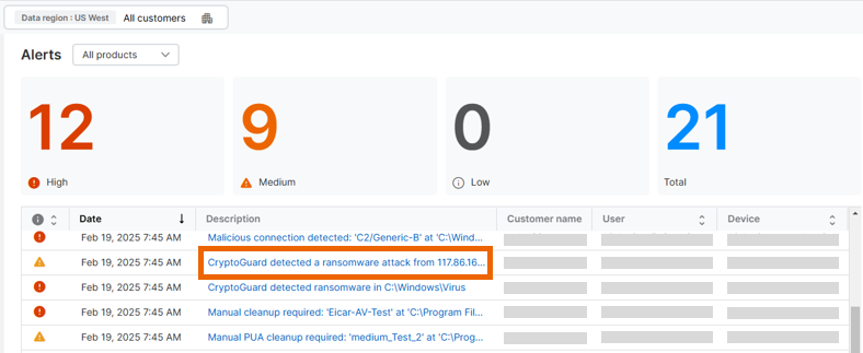 Wenn für einen Ihrer Sophos-Central-Kunden die Partnerunterstützung eingeschaltet ist, können Sie dessen Alerts anzeigen und Maßnahmen ergreifen.