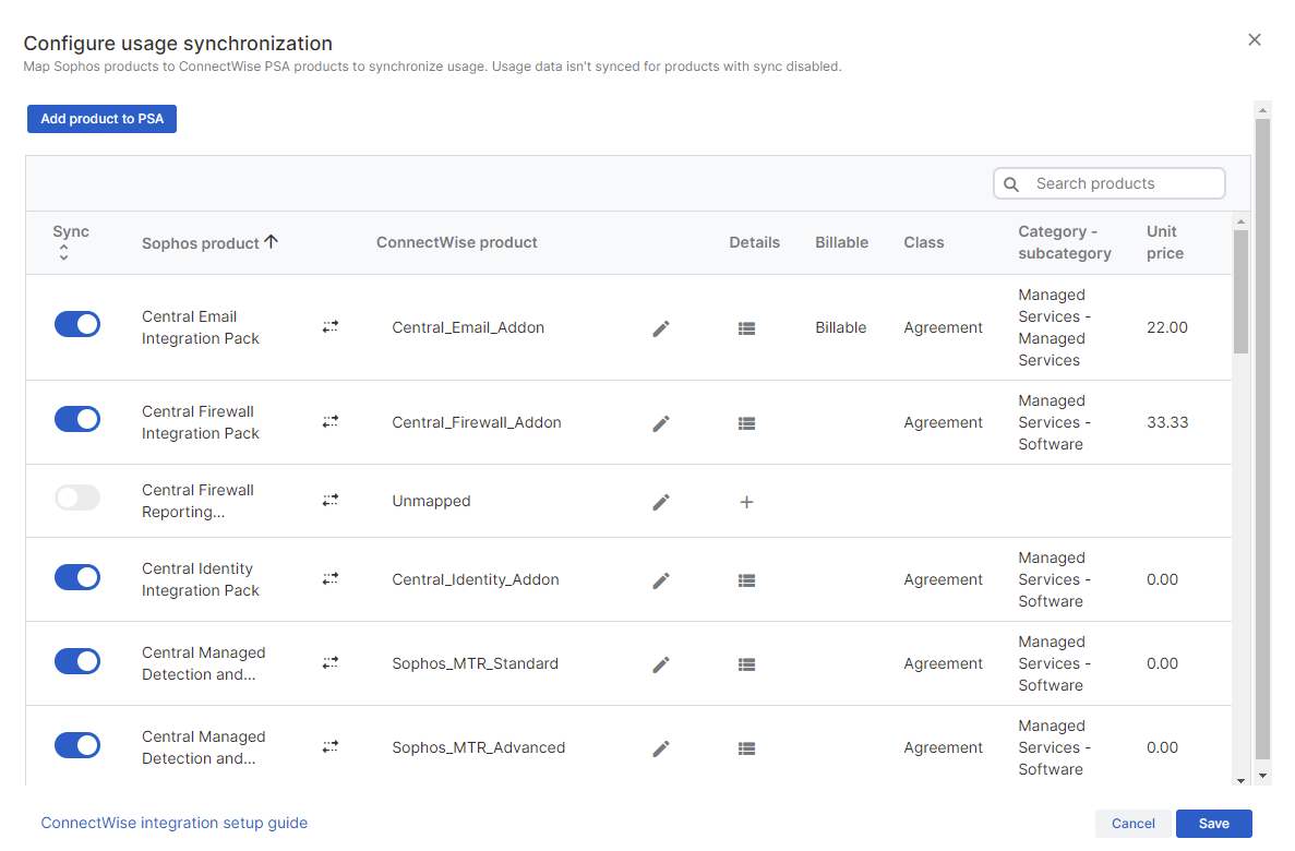 Asignar un producto Sophos a un producto ConnectWise PSA