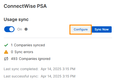 5. Dans la page Configurer la synchronisation d’utilisation, cliquez sur l’icône Détails Icône Détails. située à côté du produit ConnectWise que vous souhaitez modifier.