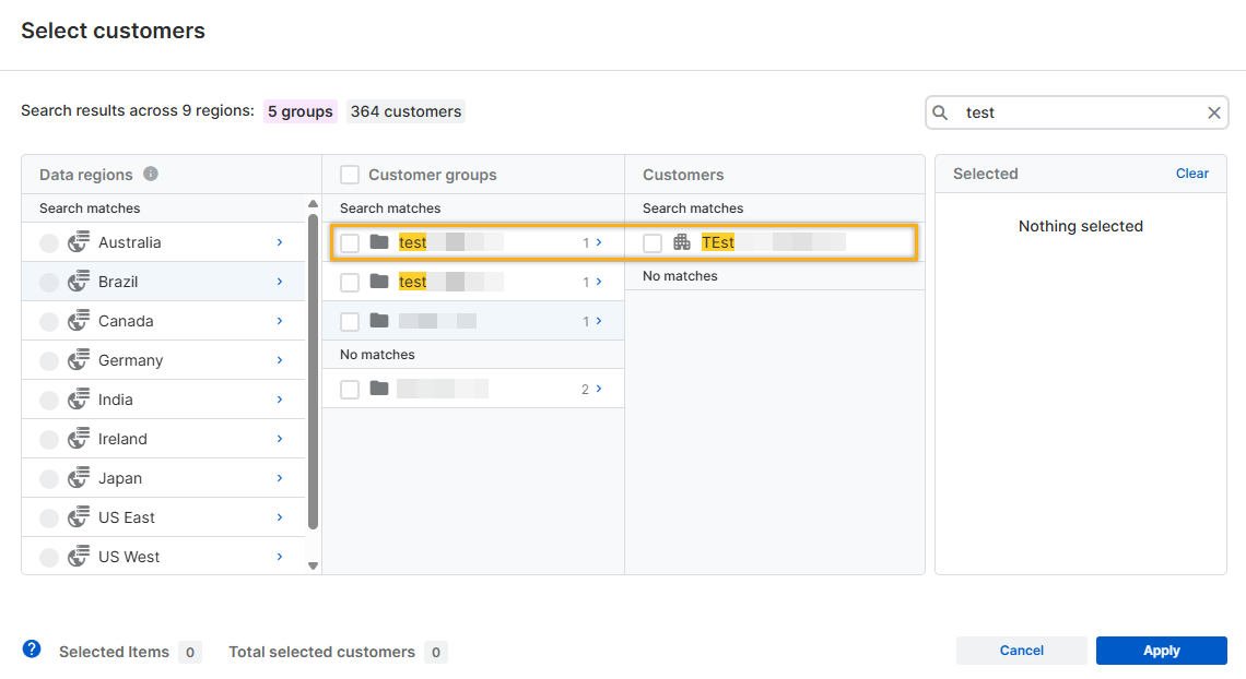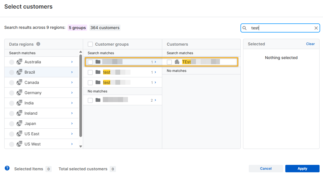 グループ名に "test" が含まれ、一致する顧客が含まれている場合、その顧客は「 顧客」 列の「一致した検索」に表示されます。