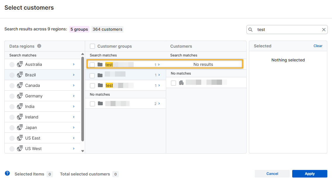 グループの名前に "test" が含まれているが、一致する顧客がない場合、グループを展開すると、「顧客」列に「表示する結果はありません」と表示されます。