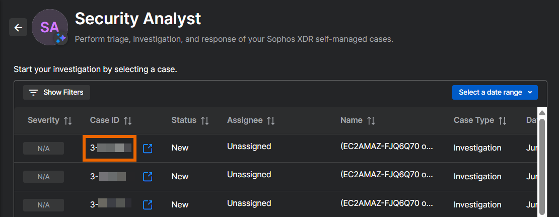 Eine Liste der Fälle wird angezeigt. Der Sicherheitsanalyst kann sowohl bei von Sophos verwalteten Fällen als auch bei selbstverwalteten Fällen helfen.